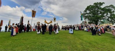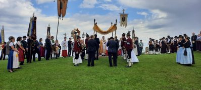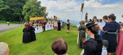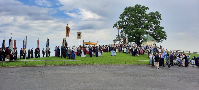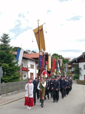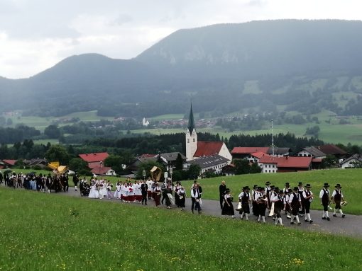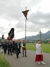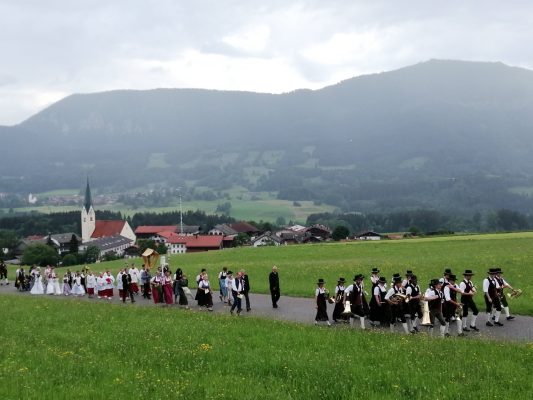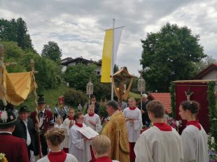 „Nicht austreten, sondern antreten und auftreten für die Kirche und den Glauben“, so appellierte Samerbergs Diakon Günter Schmitzberger zum Auftakt der diesjährigen Fronleichnamsprozession an die zahlreichen Gläubigen der Pfarrei. Nach dem feierlichen Gottesdienst in der Pfarrkirche Maria Himmelfahrt in Törwang zog die Prozession begleitet von der Musikkapelle Samerberg, dem Kirchenchor und den Fahnenabordnungen der Vereine durch das Dorf Törwang und hinauf zur Aussichtskapelle bei Obereck. Drei Altäre waren bunt geschmückt und Petrus meinte es gut mit dem Samerbergern: nur wenige Regentropfen sorgten zwischendurch für Abkühlung.