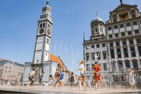 Bericht und Bilder: Prof. Dr. Klaus Wolf / Bayernbund Landesverband Bayern / WBR / Fritz Lutzenberger – Augsburger Rathausplatz im Sommer https://www.augsburger-stadtsommer.de/playfountain