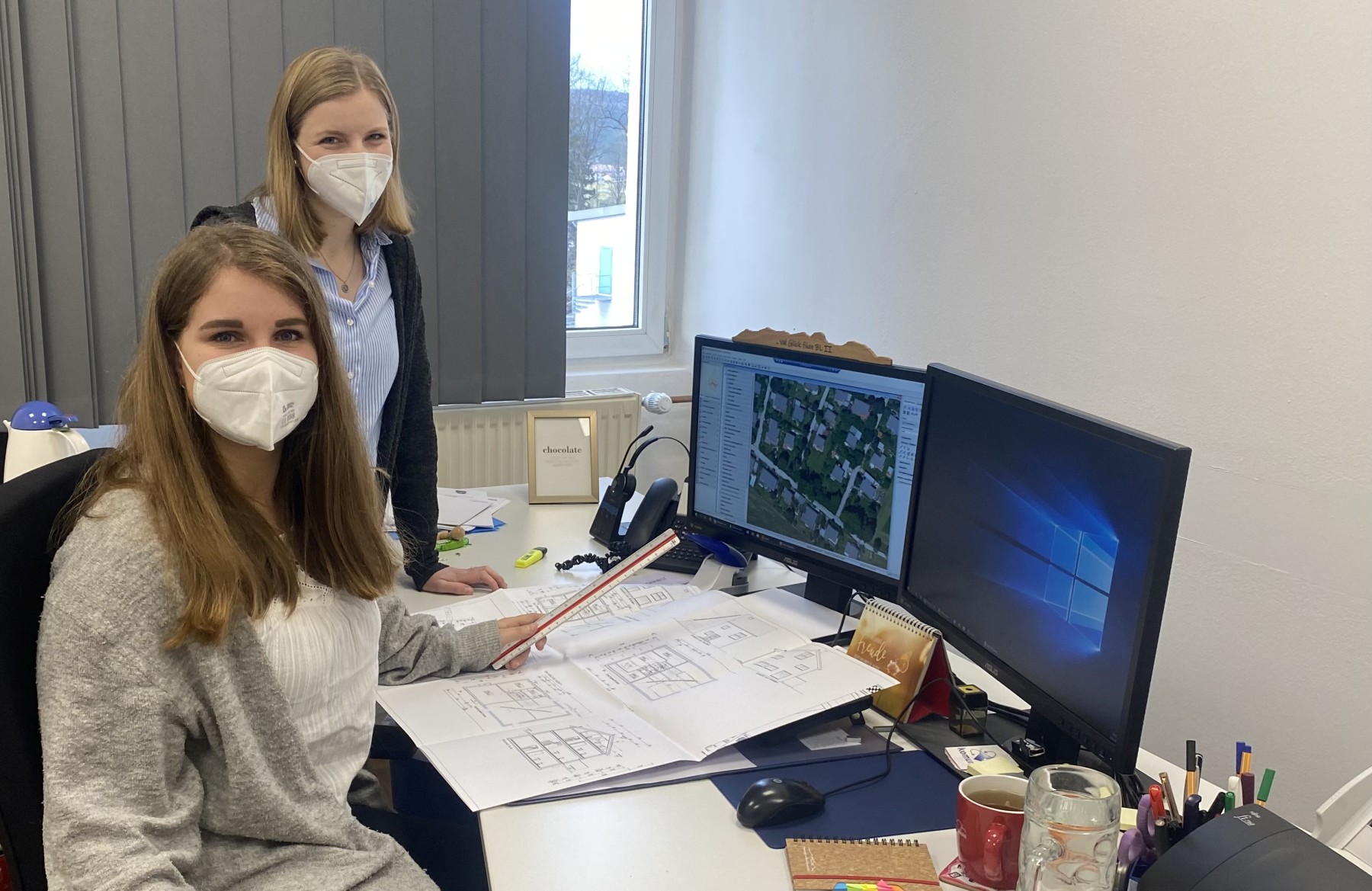Ausbildungsleiterin Christina Breier (sitzend) erklärt Auszubildender Juliane Mayroth digital und mit Detailskizzen auf Papier einen Bebauungsplan. Foto Mischi