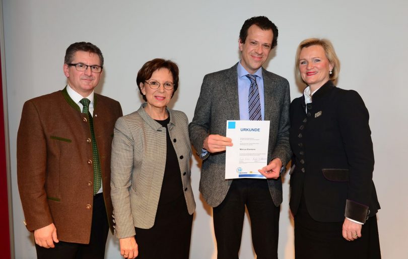 Marcus Eismann vom Alpenhotel Wittelsbach in Ruhpolding konnte beim Ausbildungsbotschaftertag des bayerischen Gastgewerbes zum Ausbildungsbotschafter ernannt werden. Diese anerkennende Auszeichnung nahmen Bayerns Arbeitsministerin Emilia Müller und Angela Inselkammer, Präsidentin des Bayerischen Hotel- und Gaststättenverbandes DEHOGA Bayern vor. Frau Inselkammer bezeichnete dabei Marcus Eismann als Vorzeigeunternehmer und sie machte deutlich, dass vor dem Hintergrund eines weiterhin wachsenden Tourismus die Mitarbeiterplanung die zentrale Aufgabe eines Betriebs ist. Unsere Aufnahme zeigt von links: 2. Vizepräsident der DEHOGA Bayern, Andreas Brunner vom Natur- und Wohlfühlhotel Brunner Hof in Arnschwang, Staatsministerin Emilia Müller, Marcus Eismann vom Alpenhotel Wittelsbach in Ruhpolding und DEHOGA-Bayern-Präsidentin Angela Inselkammer.