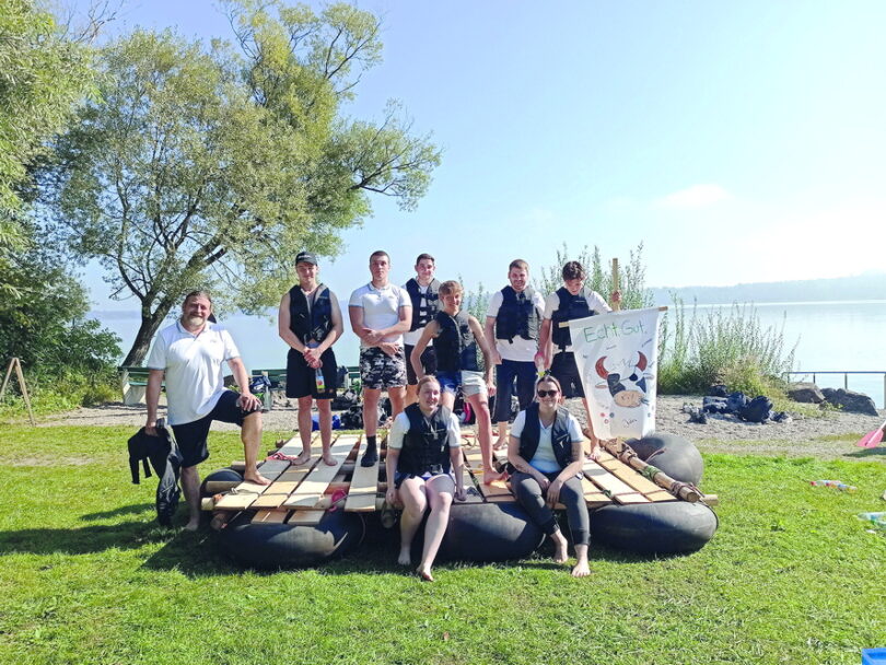 Bericht und Bilder: Milchwerke Berchtesgadener Land / Daniela Hüttinger, Personalleiterin Molkerei Berchtesgadener Land  – So ein Floßbau ist nur im Team erfolgreich: Deshalb ist beim jährlichen Azubi-Ausflug die Zusammenarbeit aller rund 30 Auszubildenden aus den Abteilungen Verwaltung, IT, Labor, Produktion, Lager und Werkstatt der Molkerei Berchtesgadener Land gemeinsam mit Ausbilder:innen gefordert.