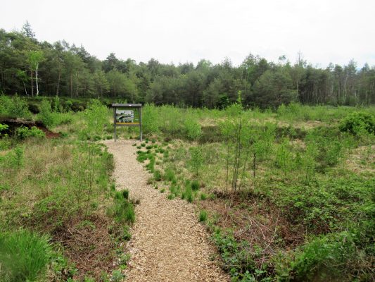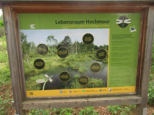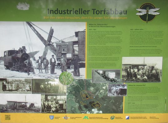 Info-Tafeln informieren über die geologische Entstehungsgeschichte,  über bäuerlichen oder industriellen Torfabbau, über das ehemalige Reichsarbeitsdienstlager,  sowie über die verschiedenen Phasen, die bei der Renaturierung alter Handtorfstiche durchlaufen werden (Abbau, Wiedervernässung, Moorentwicklung) .