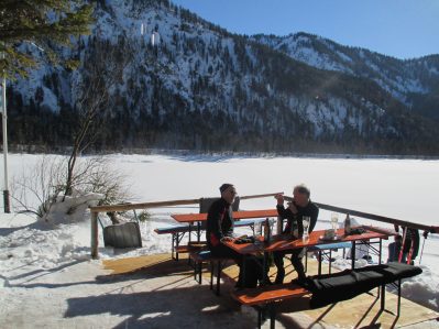 Fusswanderer oder Langläufer können in der vom Parkplatz zu Fuss in einer halben Stunde erreichbaren Mitterseealm auf der sonnigen Terrasse die schöne Landschaft und eine gute Brotzeit genießen. Die nur im Winter bewirtschaftete Hütte, die mit dem Auto nicht erreichbar ist, ist der perfekte Sonenplatz im ansonsten eisig kalten Dreiseengebiet..