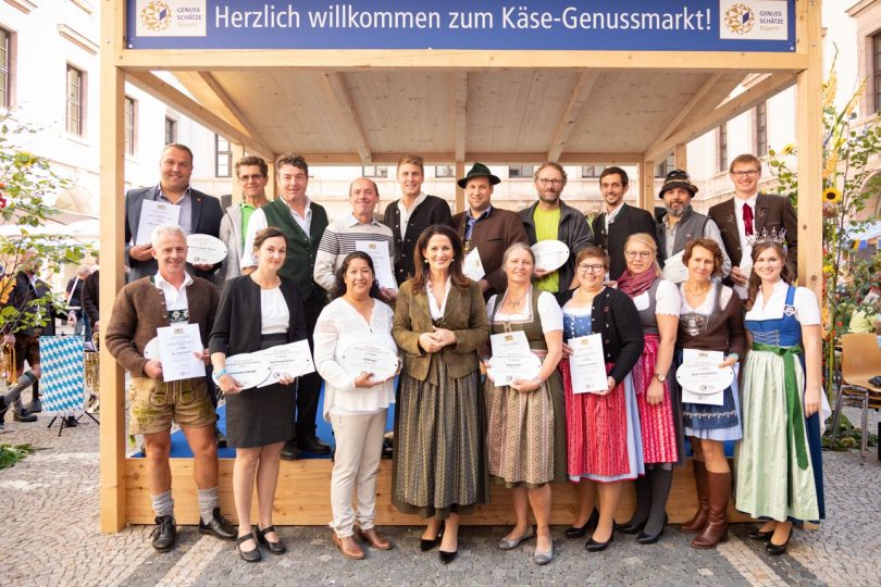 24 Bayerische Käsespezialitäten hat Landwirtschaftsministerin Michaela Kaniber am Sonntag (30. September) beim ersten Käse-Genussmarkt im Schmuckhof ihres Ministeriums in München ausgezeichnet. Sie sind die Gewinner des Wettbewerbs „Bayerische Käseschätze“, den die Ministerin im Frühjahr gestartet hatte. „In allen Regionen unseres Landes gibt es noch viele unentdeckte und außergewöhnliche Genuss-Schätze, die wir stärker ins Blickfeld der Öffentlichkeit rücken wollen“, so Kaniber bei der Prämierung. Die Sieger stammen von 13 handwerklichen Käsereien aus den Landkreisen Ansbach, Aschaffenburg, Augsburg, Dachau, Erding, Landshut, Miesbach, Neustadt a. d. Aisch-Bad Windsheim, Oberallgäu, Ostallgäu und Rosenheim. Eine Expertenjury aus Sensorikern, Sommeliers und Fachjournalisten hatte die 67 eingereichten Spezialitäten aus Weich- und halbfestem Schnittkäse in den Kategorien Weißschimmelkäse, Natur, Kräuter & Gewürze, Schaf, Ziege & Co sowie Rotschmierkäse nach Aussehen, Geruch, Geschmack und Beschaffenheit bewertet. Auf dem Genussmarkt konnten die Besucher die Käseschätze nicht nur probieren, sie durften auch den „Publikumsliebling“ küren. Am besten schmeckte Ihnen das Gewitterwölkchen, ein Weichkäse aus Ziegenmilch vom Ziegenhof Peters Glück in Marktbergel (Lkr. Neustadt a. d. Aisch-Bad Windsheim).