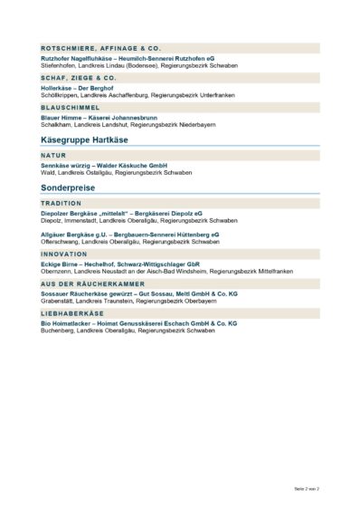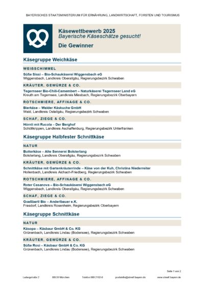 Bei der Auszeichnung der Preisträger sagte die Ministerin: „In allen Regionen unseres Landes gibt es viele außergewöhnliche kulinarische Genuss-Schätze, die darauf warten, entdeckt zu werden. Sie sind die besten Botschafter für die Vielfalt bayerischer Käsespezialitäten und den Genuss aus Bayern.“ Die Preisträger sind die jeweiligen Sieger in den Kategorien Weichkäse, halbfester Schnittkäse, Schnitt- und Hartkäse aus kleinen und kleinesten Käseküchen des Freistaats. Sie stammen heuer aus 15 handwerklichen Käsereien in den Landkreisen Aichach-Friedberg, Aschaffenburg, Landshut, Miesbach, Neustadt an der Aisch-Bad Windsheim, Oberallgäu, Ostallgäu, Rosenheim, Lindau (Bodensee) und Traunstein. Eine fachkundige Expertenjury aus Sensorikern, Sommeliers und Geschichtenprüfern hatte die eingereichten Spezialitäten in den verschiedenen Kategorien nach Aussehen, Geruch, Geschmack und Beschaffenheit sowie der Geschichte zur Herstellung des Käses bewertet.