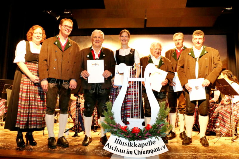 Michaela Haindl, Bezirksjugendleiterin Inn-Chiemgau des Musikbundes Ober- und Niederbayern und der Vorsitzende der Aschauer Musikkapelle Simon Pertl zeichneten (von link) Helmut Gawlik (60 Jahre) – Anna Mayer (Goldenes Leistungsabzeichen) – Georg Antretter (60) – Peter Anner (40) – Andreas Steinberger (40) mit der Urkunde und dem Ehrenzeichen des Musikbundes aus.