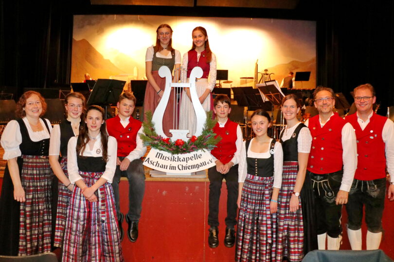 Anna Mayer erhielt von Michaela Haindl, das Leistungsabzeichen des Musikbundes Ober- und Niederbayern in Gold für ihr Spiel auf der Querflöte. „Die Leistungen, die für dieses Abzeichen erbracht werden müssen, sind immens. Entsprechend selten wird es verliehen und die wenigen Träger des Goldenen Abzeichens stellen schon eine Elite innerhalb der Musikanten des Musikbundes von Ober- und Niederbayern dar“. Als Vorstufe zum goldenen Abzeichen erfüllte Anna Mayer auch die Bedingungen für das silberne Abzeichen zusammen mit Annika Pertl (Querflöte). Das Abzeichen in Bronze erhielten Maxi Gawlik, Katharina Thaurer, Antonia Schwingenheuer, Leonhard Anner, Annika und Marlen Pertl, sowie Helena Rottmüller „Es hat dieses Mal viel länger gedauert und wir mussten sogar Teile der Theorie übers Internet abwickeln. Alle miteinander haben sich sehr gut auf die Theorieprüfung, die sehr umfangreich und fordernd war, vorbereitet. Auch die Praxis haben sie auf ihren Instrumenten gut gemeistert“, so Michaela Haindl bei der Preisverleihung. Über 200 junge Musikanten beteiligten sich im ganzen Bezirk an dieser Prüfung. Ein bisschen etwas von ihrem Können zeigten die Burschen und Mädchen zwischen elf und 16 Jahren in der Jugendkapelle unter der Leitung von Lothar Beyschlag im Vorprogramm des Jahreskonzertes in der Festhalle, die älteren spielten bereits in den Registern der Aschauer Musikkapelle.