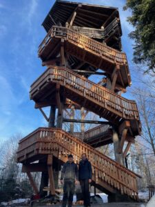 Robert Sterl von der Zimmerei Schiller erläuterte Nationalparkleiterin Ursula Schuster die abgeschlossenen Maßnahmen am Turm. (Foto: Johannes Dick/Nationalpark Bayerischer Wald)