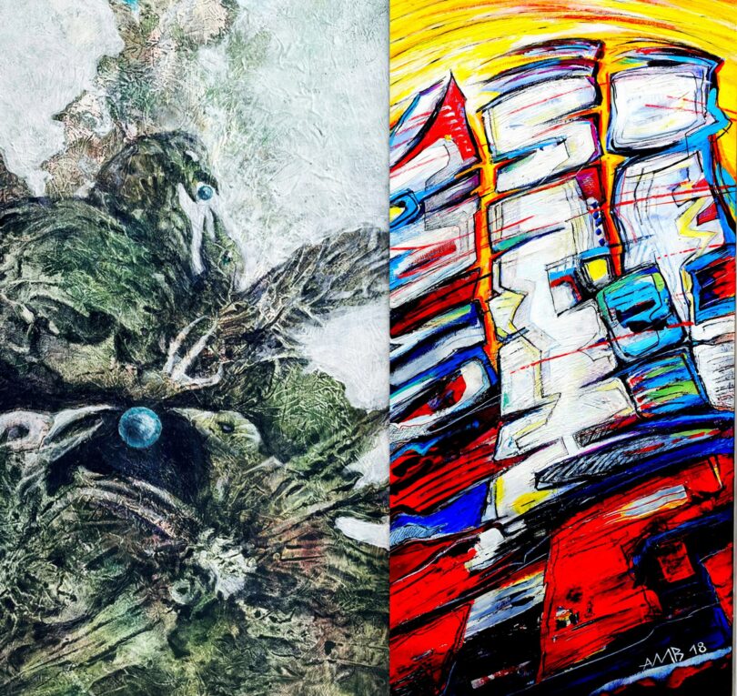 Beide Künstler zeigen keine gegenständlichen Landschaftsbilder. Bei Anton Michael Bader entstehen farbstarke, intuitiv geprägte „Farblandschaften“, die inspiriert sind von archaischen Naturphänomenen wie den wasserzerfressenen Felsen des Karsts, den Vulkanspalten und Gletschern Islands oder von bizarren Felsformationen der Alpen. Auch Sturm oder Wasser können Anstoß sein für den künstlerischen Prozess, der Acryl und verschiedene zeichnerische Techniken vereint.