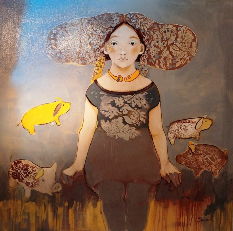 wiedergeben, sondern den Wesenskern, das, was sich hinter dem Äußeren verbirgt. Alle Frauenbildnisse, deren Gesichter oft androgyne Gesichtszüge haben – wie Engel – strahlen eine geheimnisvolle, mystische Aura aus. Immer tragen sie schöne Gewänder, Kleider oder Röcke mit phantasievollen Mustern, die mit den Mustern des Hintergrunds harmonieren und bisweilen auch verschmelzen. Dazu haben sie, oft kunstvoll verschlungene Kopfbedeckungen, Hut ähnliche Gebilde, die ihren Trägerinnen eine besondere Würde verleihen. Immer sind die Frauenfiguren mit symbolischen Dingen umgeben, einem Lämmchen, einem kleinen Kalb, Schweinchen, einer Gans, alles farblich harmonisch abgestimmt mit dem Bildhintergrund, der oft Motive aus der Pflanzen- und Tierwelt enthält, die wieder symbolisch die Verbindung von Natur und Mensch darstellen.