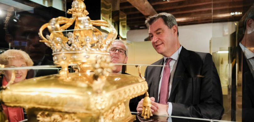 Die Sonderausstellung „Bayerns Gold“ ist hier in der Kaiserburg goldrichtig. Eine einzigartige Ausstellung – die ganze Geschichte von Bayerns Gold anschaulich präsentiert in einem großen Goldbarren“, sagte Ministerpräsident Dr. Markus Söder anlässlich der feierlichen Eröffnung der Sonderausstellung „Bayerns Gold“ im Hochzeitszimmer der Kaiserburg Nürnberg. „Die Kaiserburg Nürnberg ist eine Schatztruhe, prall gefüllt mit Kunst und Kultur, die nun bis zum Herbst 2018 besonders glänzt“, so Söder weiter.
