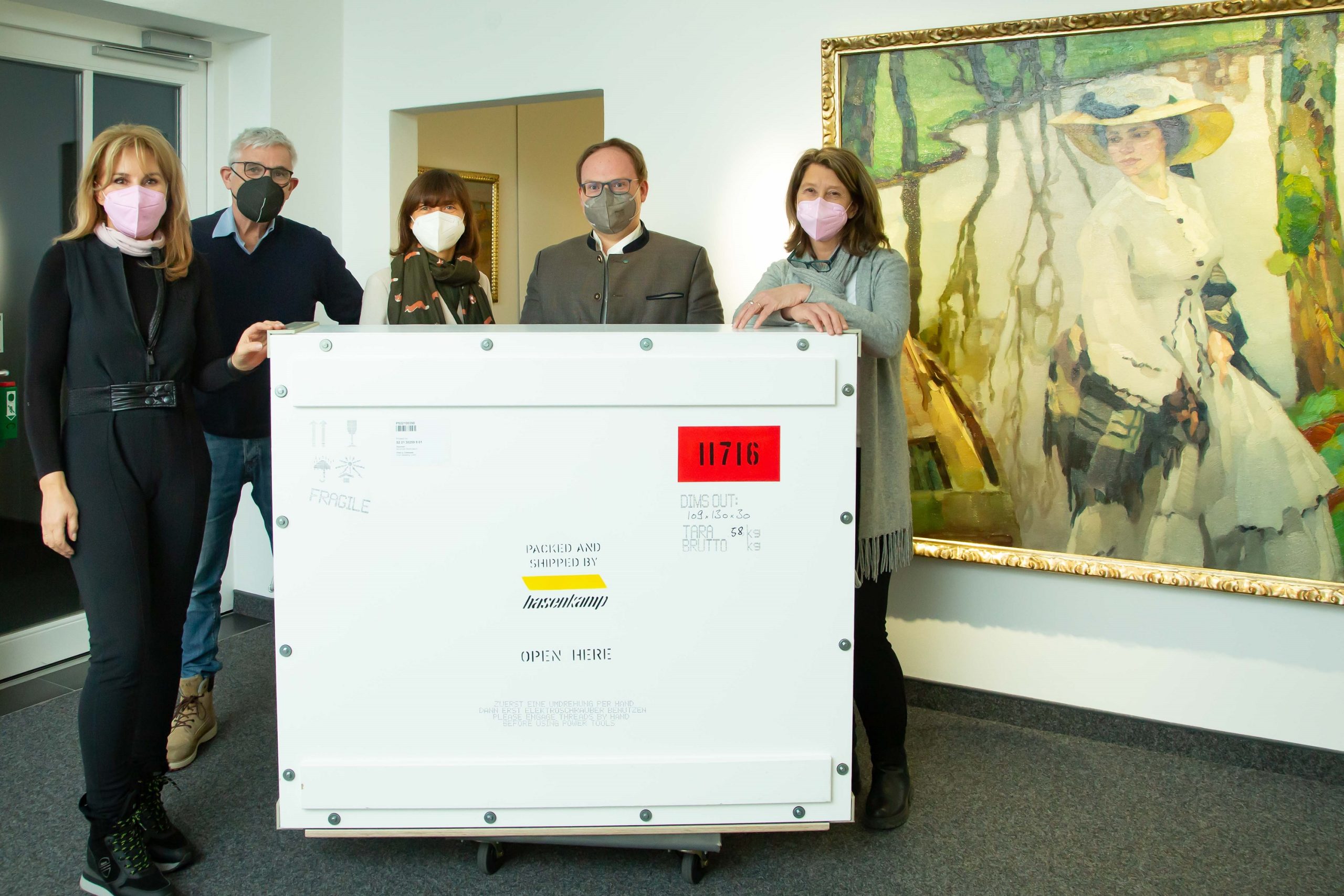 Ob in Museums- oder in Privatbesitz – alle Kunstwerke werden bei Anlieferung von den Kuratorinnen sorgfältig geprüft, bevor sie für die Ausstellungsdauer von „Glanzvoll“ ihren festen Platz in der Galerie im Alten Rathaus erhalten. (v.l.n.r.) Aufwendig verpackt in speziellen Klimaboxen wurden am vergangenen Donnerstag drei hochkarätige Leihgaben von der Kuratorin Ingrid Fricke M.A., dem Ersten Vorsitzenden des Kulturfördervereins Prien am Chiemsee e,V, Georg Klampfleuthner, der Geschäftsführerin der Prien Marketing GmbH Andrea Hübner, dem Ersten Bürgermeister der Marktgemeinde Andreas Friedrich und der Kuratorin Ute Gladigau M.A. in Empfang genommen.