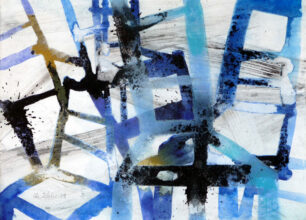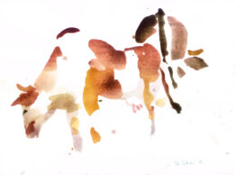 Wir beschäftigen uns dann mit den ausgestellten Bildern. Die Atmosphäre eines ehemaligen Kuhstalls mit einem Ambiente, das eine gewisse Verbindung zum Pleinair hat, hat ihn besonders gereizt. Viele der Aquarelle sind vor Ort entstanden, andere im Atelier. Seine reduzierte Malweise lässt dem Betrachter die Möglichkeit, eigenes Empfinden in die Interpretation miteinzubeziehen. Typisch dafür sind Bilder auf denen Farbflecken neben großen weißen Flächen ein Motiv nur andeuten ohne es auszuformulieren, wie z.B. bei den Bildern “Zagora, Tissergate”, “Rajasthan, Jaipur, Inder” oder den in Flecken aufgelösten “Kühen”.