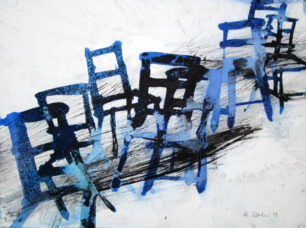 Christian Eckerl zeigt mir dann eine umfangreiche Bildergalerie auf seinem Notebook. Besonders viel bedeutet ihm das Bild “Schafe”, das er so gerne mag, dass er es nicht verkauft. Auch seine Bilder mit Stühlen mag er ganz besonders. Seit er in Kreta eine Ansammlung von kompliziert aufgestapelten Stühlen entdeckt hat und diese aus allen Perspektiven gemalt hat, malt er immer wieder Stuhlbilder. Ich darf dann Bilder für meinen Beitrag auswählen, die er gleich in einen Ordner schiebt und mir per Mail zuschickt. Es ist allerdings nicht ganz einfach bei der Vielzahl bildgewordener Seherlebnisse des Künstlers einen repräsentativen Querschnitt durch das Werk des Künstlers zu finden.