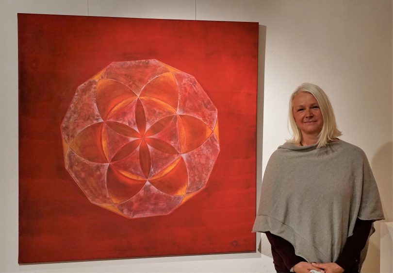 Die Rosenheimer Künstlerin Elisabeth Opperer beschäftigte sich in ihrer Vorbereitung zur Ausstellung nicht nur mit der Heiligen Geometrie, sondern auch mit dem ältesten Flachdruckverfahren, der Lithografie. So entstanden die Werke, wie Turteltauben, koloriert oder im kontrastreichen Schwarz-Weiß und Bügel-Flügel. Ebenfalls gekonnt in Gouachetechnik gemalt, konstruierte die Malerin in fantastischer Symmetrie ein Dodekagon, ein rotes Zwölfeck mit dem Titel Ursprung.