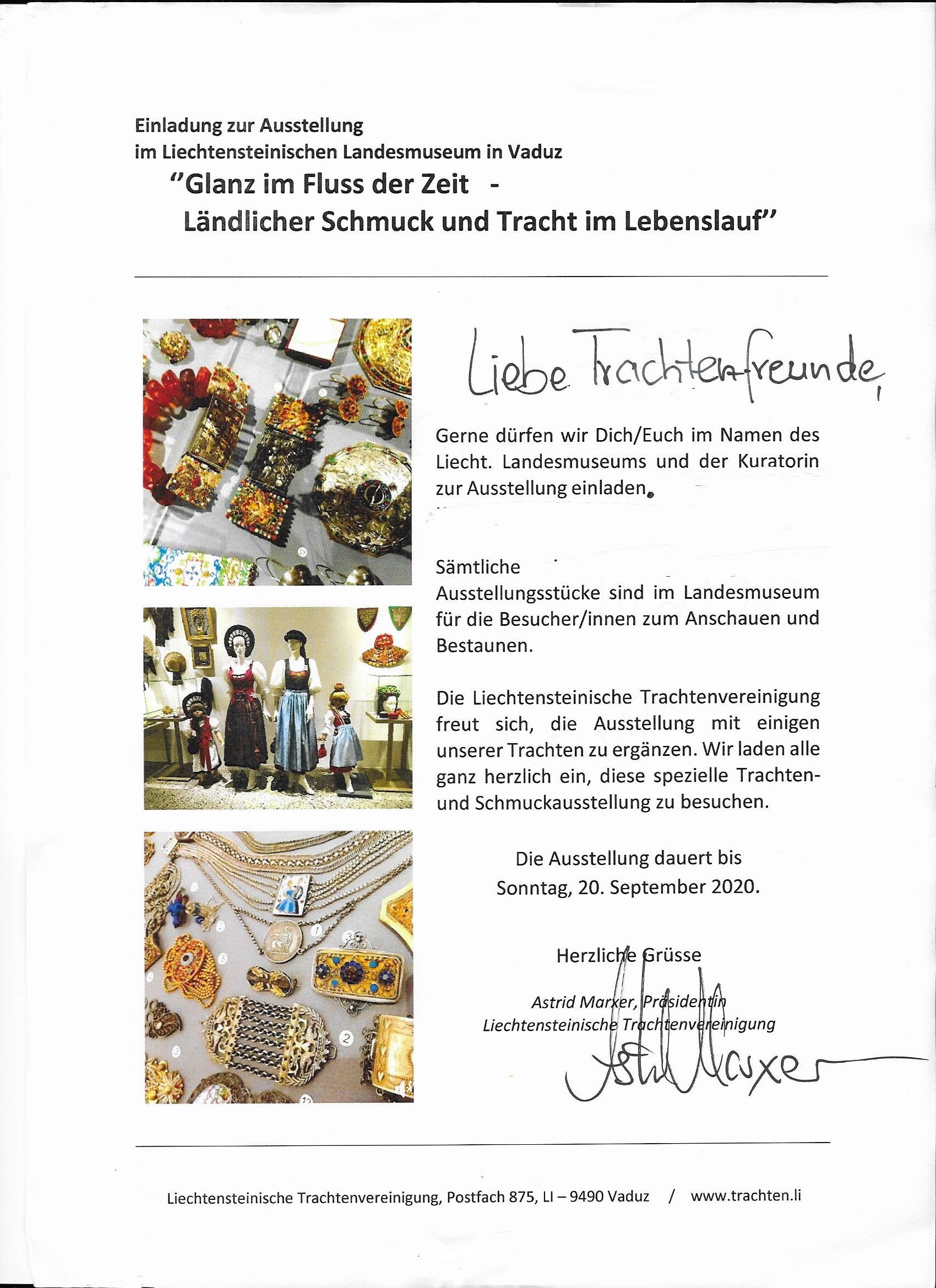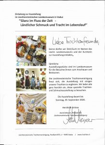 Im Liechtensteinischen Landesmuseum in Vaduz findet bis zum 20. September 2020 die Ausstellung “Ganz im Fluss der Zeit – Ländlicher Schmuck und Tracht im Lebenslauf” statt, in der unter anderem die Liechtensteinische Trachtenvereinigung ihre Trachten präsentiert. Interessierte Besucher sind herzlich willkommen.