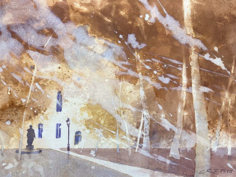 Ein ausgewiesener Aquarellist – aber nicht die dem Aquarell eigene „Schönheit der Landschaft“ sind seine Motive, nein „schöne Motive langweilen mich“ sagt er von sich. Sein Blick ist auf das augenscheinlich „Unschöne“ gerichtet, Industriebrachen und Lagerhäuser in Häfen. Ihnen aber gewinnt er Farben und Lichtgebungen ab, über die man staunt.