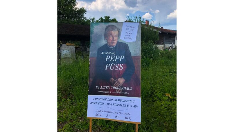 An den Sonntagen 2., 9. und 16. Juli öffnet jeweils von 10 bis 18 Uhr im alten Trogerhaus in Au bei Bad Aibling (Schmiedgasse 7) noch einmal die Ausstellung „Pepp Füss“. Gezeigt werden Ausschnitte des Lebenswerks des Malers, der in diesem alten Haus über 30 Jahre lang gelebt und gearbeitet hat. Zu sehen ist ein beeindruckendes Spektrum von Bildern zwischen altmeisterlicher Qualität und vielen sehr persönlichen Arbeiten und Erinnerungen eines Ausnahmekünstlers. Zudem wird erstmals die Filmvorschau zum Dokumentarfilm „Pepp Füß – der Künstler von Au“ (von Karola Kellner) in der Ausstellung zu sehen sein.