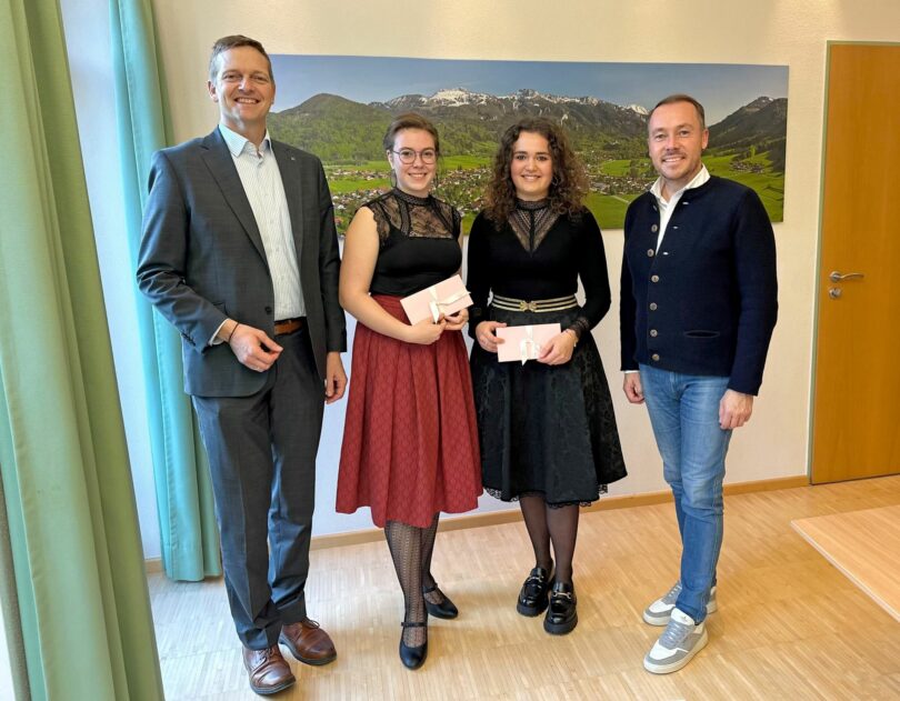 Beim diesjährigen Wettbewerb wurde das „Heiraffe Harfenduo“ mit Johanna Stein (Dritte von links) und Katharina Thaurer (Zweite von links) aus Aschau mit der höchsten Auszeichnung und dem Prädikat „Ausgezeichnet“ geehrt. Damit erhielten die beiden jungen Musikerinnen die bestmögliche Bewertung und trugen so den musikalischen Ruhm ihrer Heimat in die Welt hinaus. In Anerkennung ihrer herausragenden Leistung empfingen Aschaus Erster Bürgermeister Simon Frank (links) und Tourismuschef Herbert Reiter (rechts) die beiden „Edelweißer“-Dirndl im Aschauer Rathaus. Bei dieser Feierstunde gratulierten Frank und Reiter die talentierten Musikerinnen und lobten das Engagement und deren Einsatz. Ein besonderer Dank und hohe Wertschätzung gilt auch der langjährigen Musiklehrerin Gitti Herden, die Johanna und Katharina seit vielen Jahren fördert und als wichtige Mentorin begleitet. Herzlichen Glückwunsch, liebe Johanna und Katharina, zu diesem beeindruckenden Erfolg! Wir wünschen euch weiterhin viel Freude und Erfolg beim Musizieren.