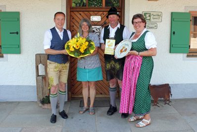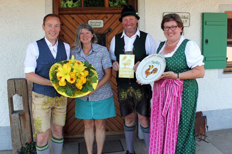 Das Ehepaar Ina und Martin Thaurer in Aschau bietet im Rahmen von „Urlaub auf dem Bauernhof“ insgesamt fünf Luxus-Ferienwohnungen an. Bei der aktuellen Auszeichnung der Bayerischen Ferienhöfe, die von den Urlaubern als besonders gastfreundlich beurteilt wurden, ist das Ehepaar Thaurer nun mit dem Goldenen Gockel als “gastfreundlichste Ferienhöfe Bayerns” ausgezeichnet worden. Der persönliche Kontakt zur Gastgeberfamilie zählt zu den großen Pluspunkten eines Urlaubs auf dem Bauernhof und machen diese Urlaubsform unvergleichlich. Nicht nur bei der Mitarbeit auf dem Hof lassen die Vermieter Ihre Gäste an Ihrem täglichen Leben teilhaben. Bei gemeinsamen Grillabenden lernt man die Familie kennen und bekommt exklusive und ganz persönliche Geheimtipps für Ihre Urlaubszeit auf dem Hof und in der Umgebung. 95 Prozent aller Reisenden lesen Gäste-Bewertungen im Internet, bevor sie ihre Buchungsentscheidung treffen. Die Meinung von anderen Gästen für die eigene Urlaubsplanung war nie so wichtig wie heute. Während bei der Sterne-Klassifizierung ausschließlich die Ausstattungsqualität unter die Lupe genommen wird, werden durch Gästebewertungen anderer Reisender auch die Bereiche Gastfreundschaft, Service und Atmosphäre auf den einzelnen Höfen durchleuchtet. Diese herausragende Ehrung gab Anlass, dass Aschaus Dritte Bürgermeisterin Monika Schmid (rechts) zusammen mit Tourismuschef Herbert Reiter offiziell gratulierten. Mit einem getöpferten „Goldenen Gockel-Teller“ wurden Ina und Martin Thaurer zur höchsten Auszeichnung und dem exklusiven Urlaubsangebot beglückwünscht. Insgesamt gibt es in Bayern über 4000 Betriebe „Urlaub auf dem Bauernhof“ und davon haben nur 20 diese besondere Auszeichnung „Goldener Gockel 2018“ erhalten.