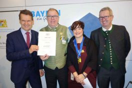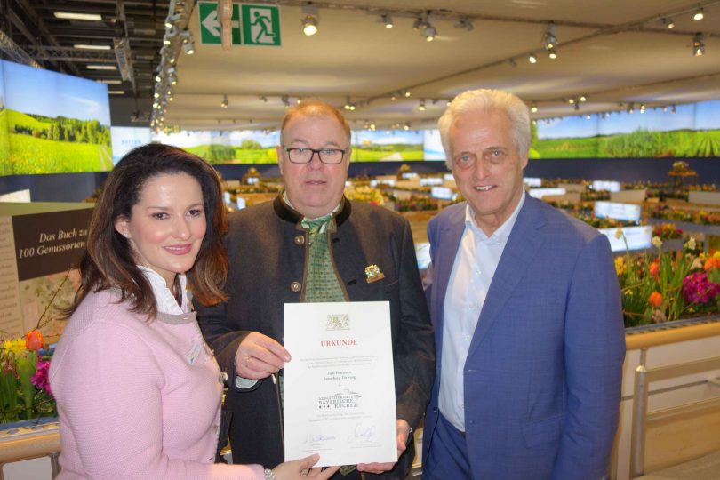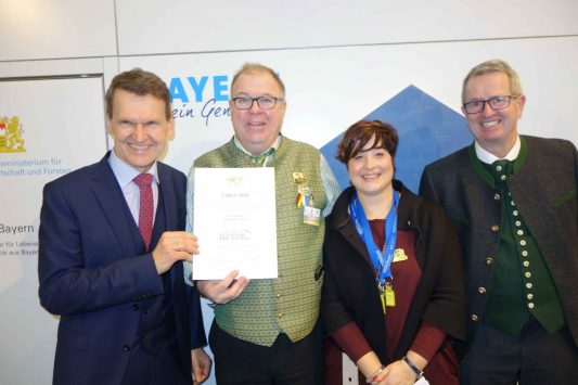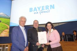 Bereits zum dritten Male konnte Entenwirt Peter Schrödl vom Samerberg vom Bayerischen Landwirtschaftsministerium die Urkunde für „Ausgezeichnete Bayerische Küche“ in Empfang nehmen. Die Auszeichnung für ideenreiche und regionale Wirtshauskultur erfolgte während der Internationalen Grünen Woche in Berlin. Dort ist Peter Schrödl seit zehn Jahren Betreiber des Biergartens in der Bayernhalle. „Unsere Wirtshäuser sind wichtige Botschafter der bayerischen Lebensart und ein Schaufenster unserer regionalen Genüsse und hier in Berlin findet das große Anerkennung“ – so die Bayerische Landwirtschaft- und Ernährungs-Ministerin Michaela Kaniber zum Entenwirt. Zu den ersten Gratulanten gehörte auch der Bundestags-Abgeordnete Peter Ramsauer. Unsere Aufnahme zeigt ihn mit Staatsministerin Michaela Kaniber und mit dem ausgezeichneten Entenwirt.