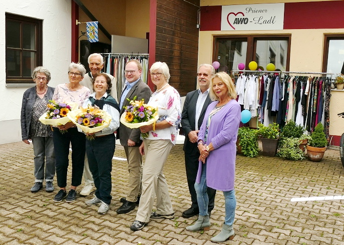 Damit das Sozialkaufhaus vor 10 Jahre überhaupt eröffnet werden konnte, leisteten Rosi Metz und Ulrich Kurth wichtige Pionierarbeit. Die damalige Vorsitzende Elke Flender-Back hatte mit ihrer Idee den Prozess ins Rollen gebracht. Das große soziale ehrenamtliche Engagement und das 10jührige Jubiläum würdigte der 1. Bürgermeister der Marktgemeinde Prien, Andreas Friedrich, mit eindrucksvollen Blumensträußen für die Mitarbeiterinnen. Bei seinem Rundgang durch den Laden und seinen Gesprächen bekam er einen umfassenden Eindruck von der geleisteten sozialen Arbeit. Andreas Friedrich sprach den Mitarbeiterinnen für das ehrenamtliche Engagement seinen Dank aus und wünschte weiterhin viel Erfolg „für unseren Priener AWO-Laden. Eine wichtige Einrichtung in unserer Gemeinde!“