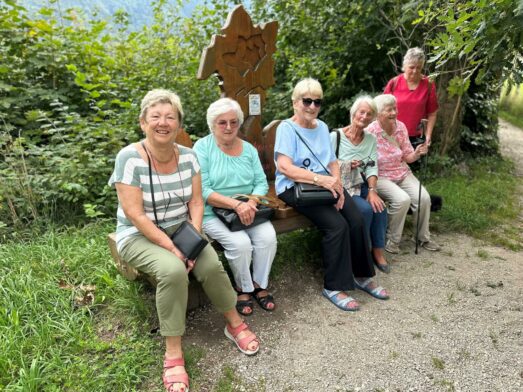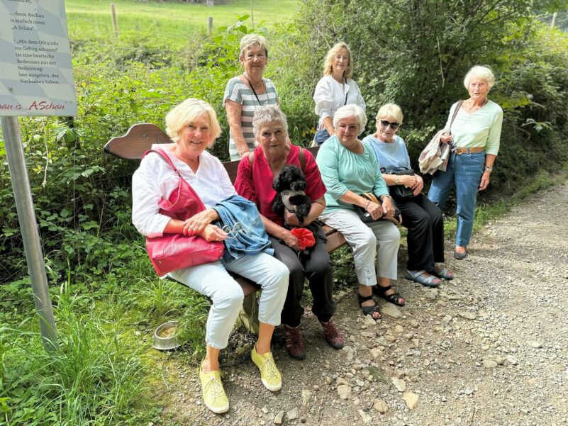Herbert Reiter, Leiter der Tourist Info von Aschau, hat es sich nicht nehmen lassen, die AWO-Gruppe über den bekannten Bankerlweg zu führen, und Hinweise und Informationen zu geben. Der Boarische Entschleunigungsweg (Bankerlweg) auf dem sich 200 besonders gestaltete Themenbänke befinden, laden zum Ausruhen und Entspannen ein. Die Bänke stehen an einem wunderschönen 1,7 km langen Wanderweg und laden zum Verweilen ein. Im Bankerldorf® Aschau im Chiemgau befinden sich insgesamt über 500 Sitzbänke, davon 200 eben ganz besondere Themenbänke, die an diesem Höhenweg liegen. Jede einzelne dieser Bänke ist ein Unikat, gespendet von Aschauer Einwohnern und zahlreichen bekannten Persönlichkeiten. Es gibt eine Alpen-Enzian-Bank. Man kann mit dem Ofenrohr ins Gebirge blicken. Gleich neben der Zamperl-Bank gibt es ein Mammut Bankerl, und an der Station „Boarisch Tamtam“ haben wir auf eine riesige Kuhglocke schlagen können, die übrigens in unserem Bad-Feilnbach hergestellt wurde. Es eröffnen sich darüber hinaus dem Betrachter auf diesem Höhenweg die schönsten Ausblicke auf das Aschauer Tal, auf Schloss Hohenaschau, die Pfarrkirche „Darstellung des Herrn“ sowie auf die Gipfel der Kampenwand. Alle Beteiligten waren begeistert über diesen Rundgang und die exzellente Führung durch den Aschauer Tourismuschef Herbert Reiter.