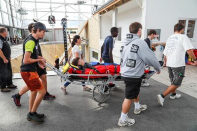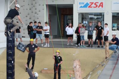 Auch an den anderen Stationen herrscht emsiges Treiben. Begleitet von Mitarbeitern des Bergwachtzentrums üben die Azubi-Gruppen und Ausbilder am Klettersteig oder beim Abseilen aus luftiger Höhe. Mut, Balance und Fingerspitzengefühl braucht man beim wackeligen Getränkekistenstapeln am Sicherungsseil. In der Kältekammer geht es bei minus zehn Grad um Wärmeschutz und das Verhalten bei Notfällen. Neben Vorträgen über Bergwachteinsätze übt eine andere Gruppe auch die Bergung von Verletzten mit Rettungssack und mobiler Trage.