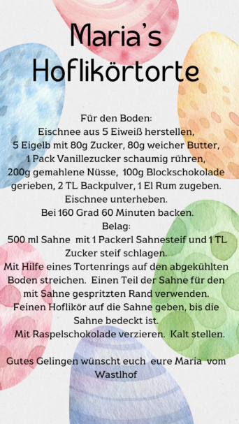 Maria vom Hofladen Wastlhof empfiehlt – natürlich mit eigenen Eiern von glücklichen Hühnern – eine leckere Hoflikörtorte und verrät uns ihr Rezept – siehe Anlage.