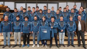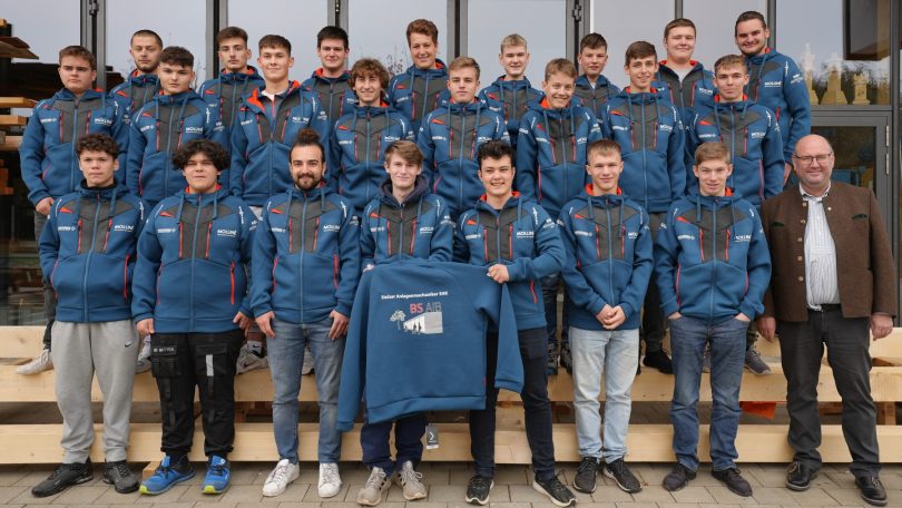 Die 54 Anlagenmechaniker-Lehrlinge von der Berufsschule Bad Aibling freuen sich über ihre Innungsshirts- und -Hoodies, die sie von Obermeister Gerhard Hardrath und OStD Jürgen Ersing überreicht bekommen haben.