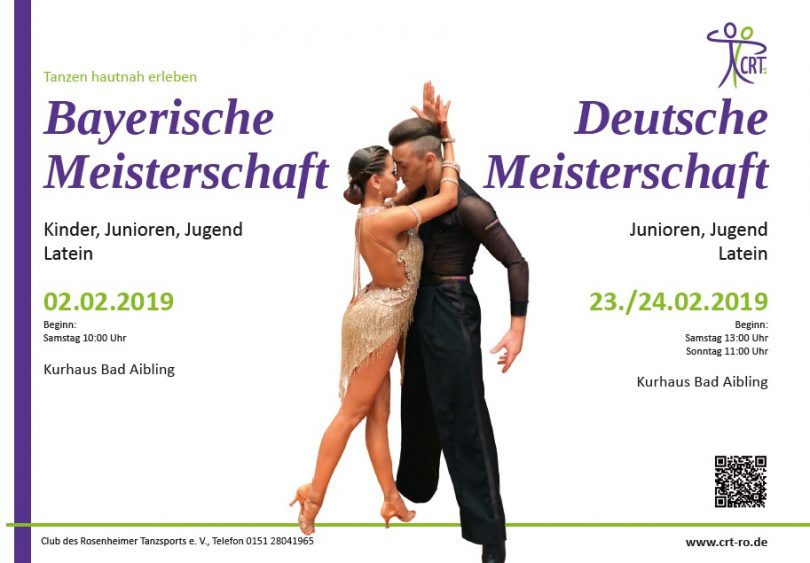 Am 02. Februar 2019 trägt der Club des Rosenheimer Tanzsports (CRT e.V.) im Kurhaus von Bad Aibling Bayerische Meisterschaften aus. Hierzu kommen Kinder und Jugendpaare im Alter von 6 bis 18 Jahren aus ganz Bayern in den Landkreis Rosenheim.