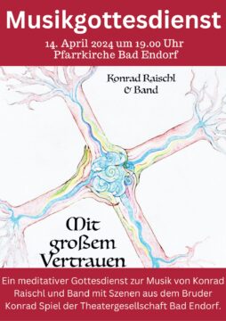 Im Rahmen der Vorbereitungen für das heurige Heiligenspiel des Bad Endorfer Volkstheaters zum Thema „Mit großem Vertrauen – Bruder Konrad“ bieten Theater und Kirche am Sonntag, 14. April einen Musikgottesdienst in der Pfarrkirche von Bad Endorf an. Beginn des meditativen Gottesdienstes zur Livemusik von Konrad Raischl und Band mit Szenen aus dem Bruder Konrad Spiel der Theatergesellschaft Bad Endorf ist um 19 Uhr.