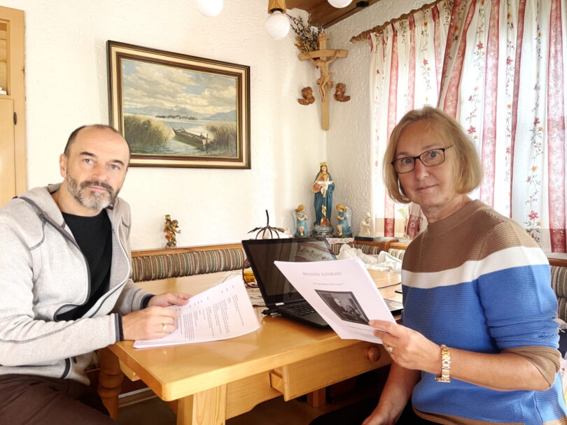 Foto: Hötzelsperger – Spielleiterin und Autorin Paula Aiblinger zusammen mit ihrem theologischen Berater Werner Hofmann mit den ersten Manuskripten für das nächstjährige Stück „Bruder Konrad“.