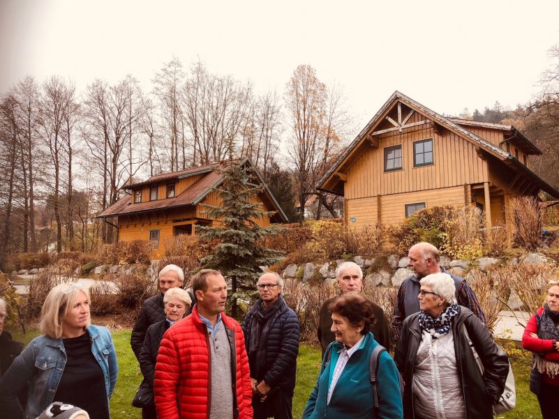 Das Öko-Feriendorf Schlierbach wurde den Bad Endorfer von Martin Tragler vorgestellt. 10 Schlierbacher Bürger haben gemeinsam ein Feriendorf mit 10 Öko-Ferienhäusern errichtet und betreiben und vermarkten dieses Feriendorf gemeinsam. Die fast 90 % Auslastung wird geschafft, weil neben den klassischen Sommergästen die Seminargäste des benachbarten Seminarhotels (Zukunftakademie SPES) das ganze Jahr kommen. Im vor 20 Jahren gebauten Seminarhotel konnte dann anschließend der Initiator des erfolgreichen und weit über die Landesgrenzen bekannten Dorferneuerungsprozesses – Der Steinbacher Weg – Herr Altbürgermeister Ing. Karl Sieghartsleitner anschaulich darstellen, wie mit kleinen finanziellen Mitteln eine nachhaltige Zukunftsentwicklung möglich ist. Dieses hoffnungsvolle Projekt, das aus Mittel der EU und des Landes Oberösterreich kofinanziert ist, hat die Delegation begeistert.