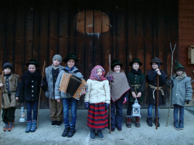 “De Feilnbacher Klöpflkinder warn auch heuer wieder unterwegs ..” – dazu heißt es weiter: “A paar Kinda ham si zammado, a Gwand ozong, a Liacht voro. An festen Stock vom Droadbodn raus und gehn damit vo Haus zu Haus.”