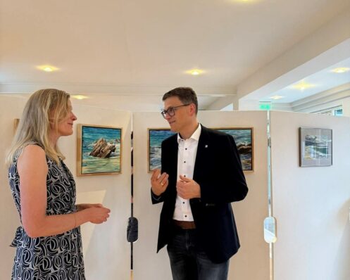 Was Memmel mit der stilistischen Vielfalt meint, zeigt die Ausstellung deutlich: Von feinen Illustrationen in Aquarell bis hin zu lockereren Arbeiten in Acryl auf Leinwand zeigte Quail ihr für sie so typisches, breites Werkspektrum! Doch auch thematisch sei die Künstlerin unverwechselbar: „Lena Quail verkörpert und zeigt in ihrer Arbeit das, wofür unsere Region steht: Herzlichkeit, eine traumhafte Landschaft und natürlich die ausgelassenen Feste, die wir miteinander feiern dürfen“, so Memmel. Das neueste Projekt, das sie gemeinsam mit der Stadt Neustadt realisiert hat, hatte Quail an diesem Abend ebenfalls im Gepäck: ein Ausmalbuch mit Ansichten aus den Neustädter Ortsteilen. Und passend zur Vernissage in Bad Gögging präsentierte sie auch eine Version für den Kurort.