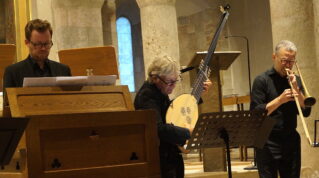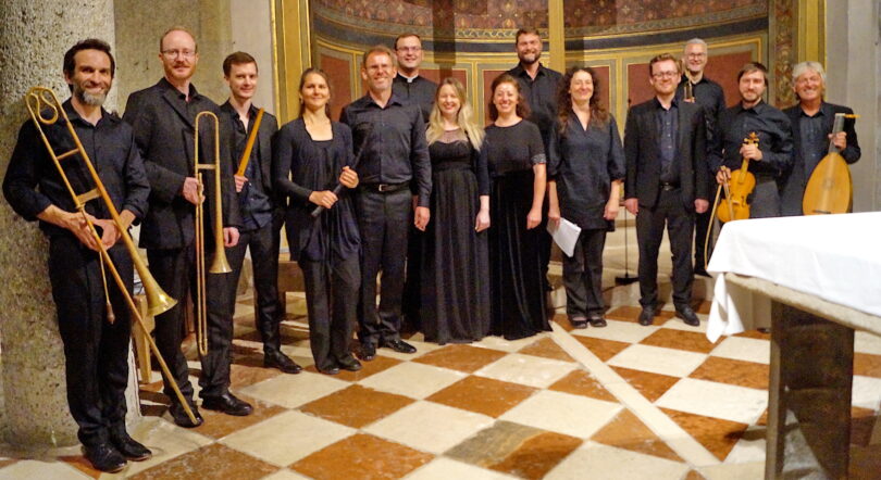 Mit Langhals- und Knickhalslaute, Barockposaunen, Zinken (historisches Blasinstrument), Barockviolinen und einer mittelalterlichen Fidel, sowie der Truhenorgel gestalteten die hervorragenden Instrumentalisten gemeinsam mit den professionellen Singstimmen musikalisch, was im lateinischen – erst später bei Heinrich Schütz auch im deutschen – Text an Emotionen (im Barock „Affekte“ genannt) ausgedrückt ist. Sie erschufen durch die historische Aufführungspraxis eine faszinierende Klangwelt. Alte Musik und eine zeitlose Bitte im romanischen Kirchenraum – die beiden Ensembles nützen die Architektur, um die frühe Mehrchörigkeit in die heutige Zeit zu holen. Die verschiedenen Niveaustufen im Altarraum dienten dieser Darbietung ebenso, wie die Empore, von der aus ein Dialog der Sänger mit den Instrumentalisten geführt wurde. Zu Beginn stellte ein Tenor des Gesangsensembles die gregorianische Antiphon „Da pacem, Domine“ vor, die als Cantus firmus oder Melodieteil in vielen der Kompositionen erscheint. Darauf machte Robert Schlegl aufmerksam und versprach eine CD für denjenigen, der die Anzahl der entsprechenden Musikpassagen im Laufe des Konzerts herausfindet.