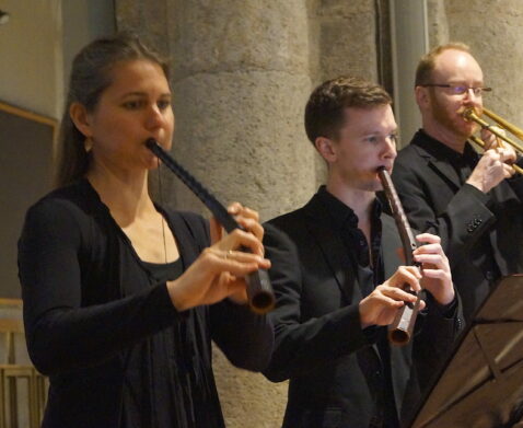 Reine Instrumentalwerke, wie die „Phantaisie 14 da pacem“ von Girolamo Parabosco (1524-1557) oder die „Music for his Majesty’s Sackbuts and Cornetts“ von Matthew Locke (1621-1677) und „Contrapuncto 95“ von Constanzo Festa (1480-1545) wechselten mit Gesang, der in unterschiedlichen Instrumental-Konstellationen begleitet wurde. Auch die Sängerinnen und Sänger stellten sich manchmal gegenüber und rahmten die Instrumente ein, um einen mehrchörigen Raumklang zu erzeugen.