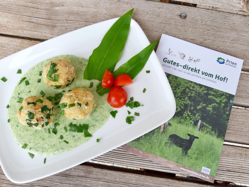 Bärlauchknödel: Knödelbrot von 10 Semmeln mit 400 ml heißer Milch durchziehen lassen, 1 Zwiebel gewürfelt, angedünstet, 2 Bund frisch gepflückter Bärlauch, 150 – 200g Hofkäse gerieben, 5 Eier , Salz, Pfeffer und Muskat zum abschmecken, vermengen, Knödel formen, in Salzwasser sieden.