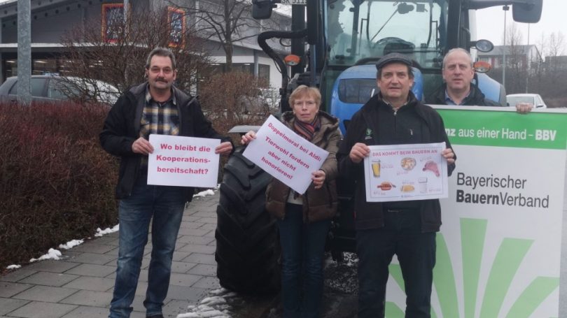 Vollmundig und mit großen Anzeigen kündigt der Lebensmitteldiscounter ALDI aktuell einen „#Haltungswechsel“ für mehr Tierwohl an. Und knausert auf der anderen Seite beim Tierwohl. Das ärgert die bayerischen Bäuerinnen und Bauern – und das bringen sie auch mit aktuellen Aktionen vor Aldi-Filialen zum Ausdruck.