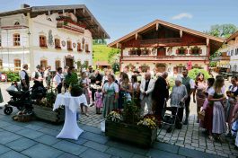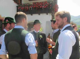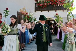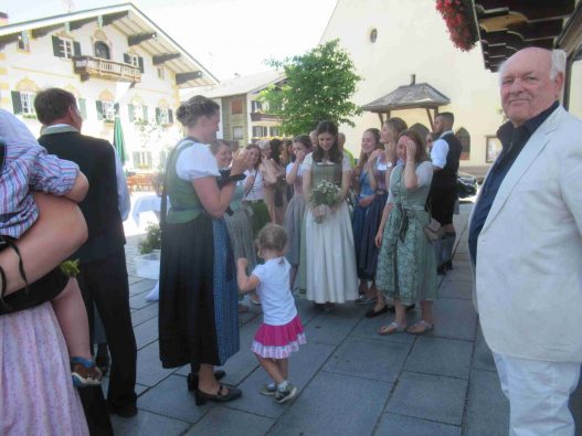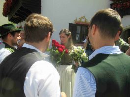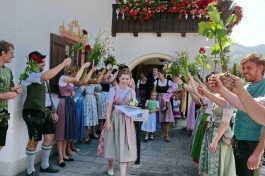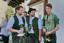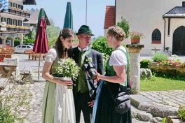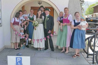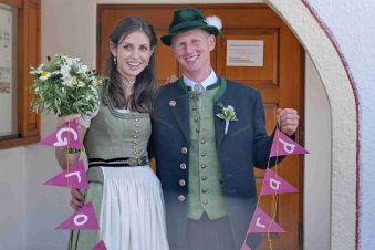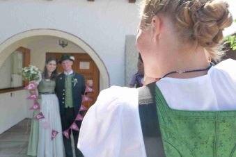 Vor ein paar Jahren war Elisabeth Moosleitner aus Vagen noch Sennerin beim Samerberger Almbauer Bartholomäus Mayer auf der Feichteckalm – nun ist sie seine frisch geheiratete Frau und Bäuerin vom Voggenauer-Anwesen in Samerberg-Schilding. Der standesamtliche Trauung mit Samerbergs Bürgermeister Georg Huber im Rathaus von Törwang wohnten die engsten Familien-Angehörigen bei. Anschließend gratulierten mit einem Blumen-Spalier auf dem Törwanger Dorfplatz die ehemaligen Kolleginnen und Kollegen vom Hauswirtschaftsmeisterinnen- und Landwirtschaftsmeister-Kurs sowie Nachbarn und Freunde vom Trachtenverein „Almenrausch“ Rossholzen.