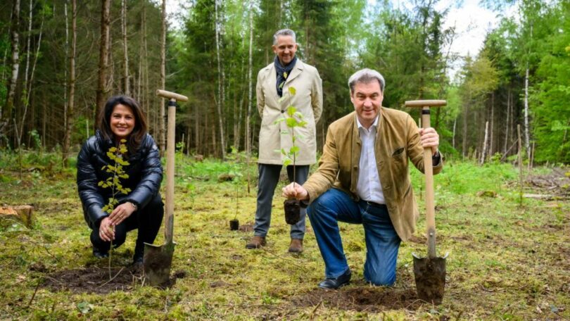Ministerpräsident Dr. Markus Söder hat am 17. Mai 2023 gemeinsam mit Forstministerin Michaela Kaniber im Anzinger Forst klimatolerante Baumsetzlinge zur Zwischenbilanz für das 30-Millionen-Bäume-Programm der Staatsregierung gepflanzt.