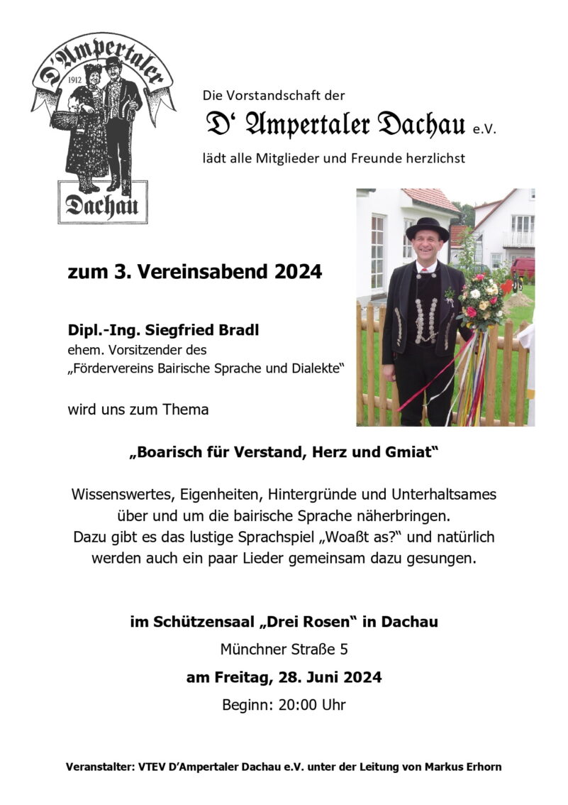 Die bairische Sprache – ein über 1500 Jahre altes Kulturgut – Siegfried Bradl beim Volkstrachten-Erahltungsverein “D’ Ampertaler Dachau” – Einladung für Freitag, 28. Juni.