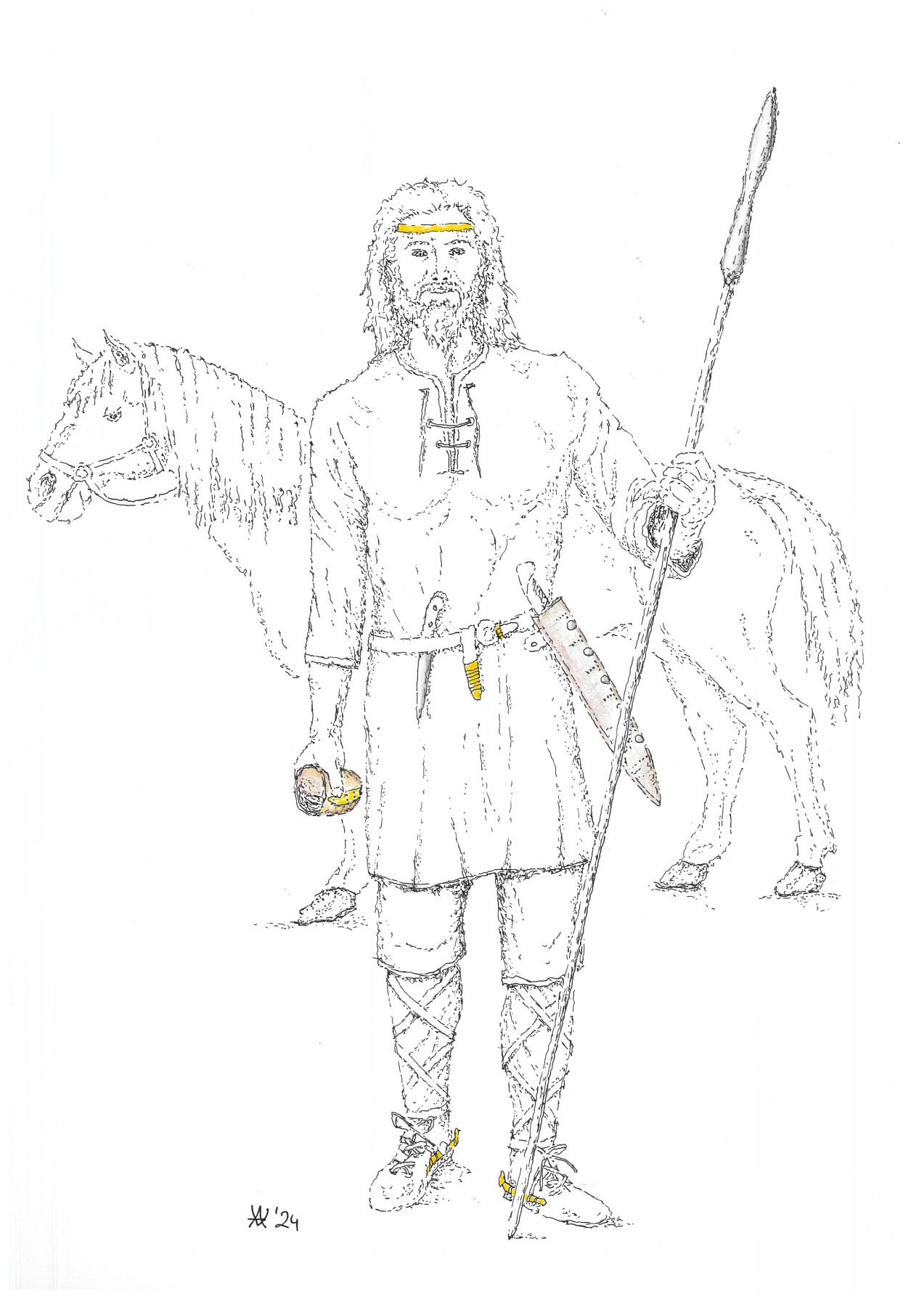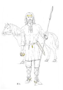 Rekonstruktionszeichnung des Fürsten von Bayerbach mit golddurchwirktem Stirnband und goldglänzenden Accessoires. In der einen Hand hält er die im Grab gefundene Lanze, in der anderen den Sturzbecher. Die Funde aus dem Grab sind farbig markiert (Zeichnung: Landratsamt Landshut, A. Valenta).