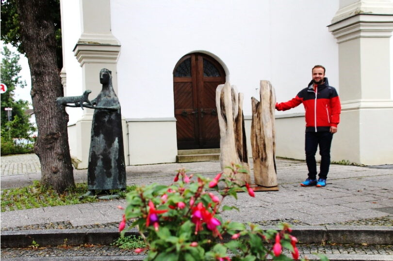 Bericht und Bild: www.tourismus.prien.de Marco Bruckner – vor dem Eingang zur Pfarrkirche Mariä Himmelfahrt vereinen zwei wunderschöne Kunstwerke einen Gedanken – sich Einlassen auf Glauben, Menschlichkeit und Zuversicht – (Foto ekh)