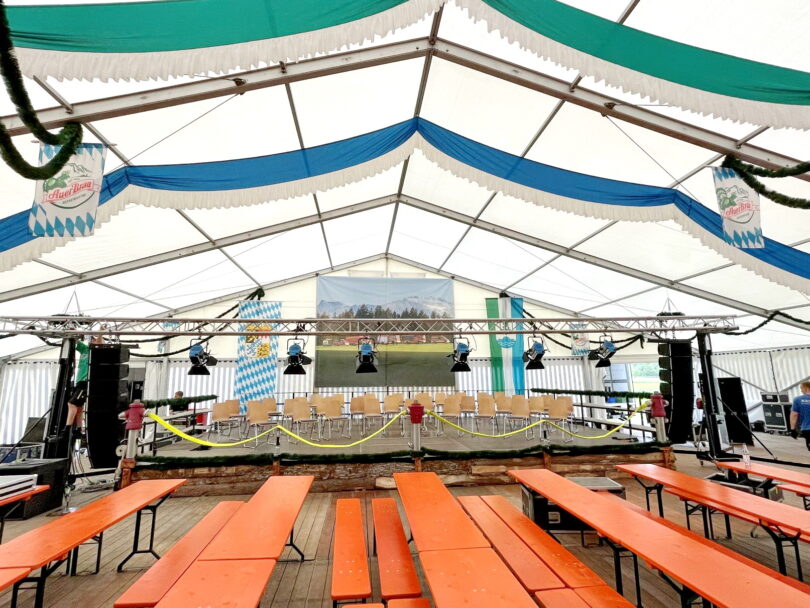 In der Buchenstraße – gegenüber vom Sportplatz – wurde in den letzten Tagen das Festzelt mit „Spritznbar“ sowie ein gemütlicher Biergarten samt Weißbierbar eingerichtet und steht nun für die 150-Jahr-Feier der FFW Bernau bereit.