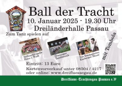 Am Freitag, 10. Januar 2025 ist es wieder so weit. Mit dem „Ball der Tracht“ des Dreiflüsse-Trachtengaues Passau wird die Ballsaison in Passau eröffnet. Zum dritten Mal laden die Trachtler zum „Ball der Tracht“ alle Tanzbegeisterten in die Dreiländerhalle ein. Eintrittskarten können im Vorverkauf bestellt werden, wie Gauvorstand Walter Söldner informiert. Aber auch in der Abendkasse sind Eintrittskarten für die Kurzentschlossenen zu bekommen.