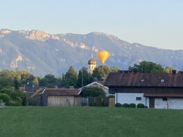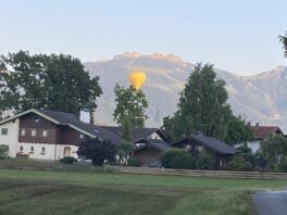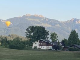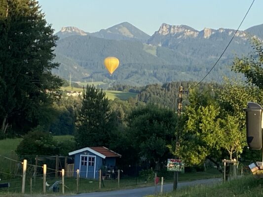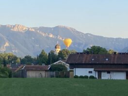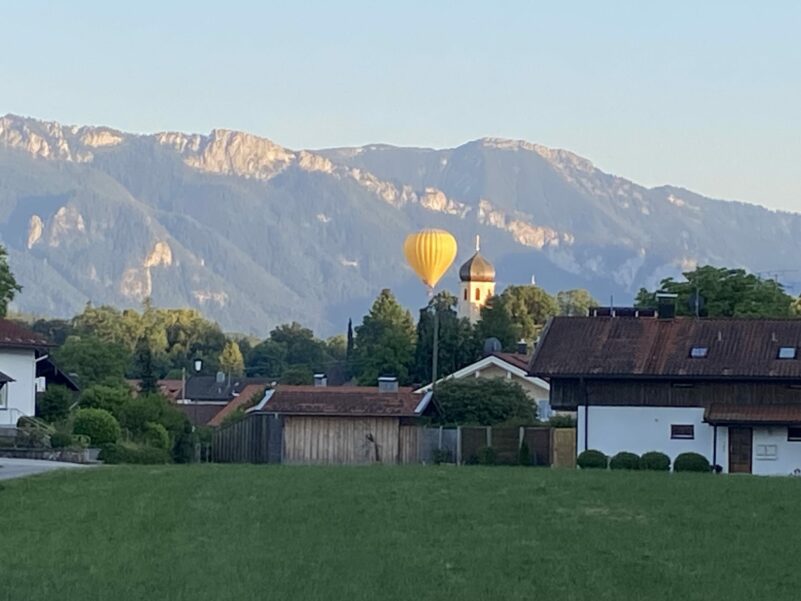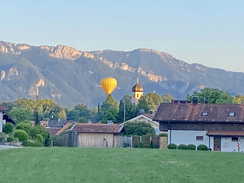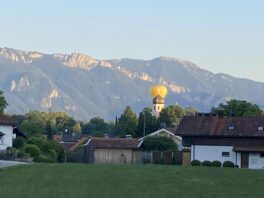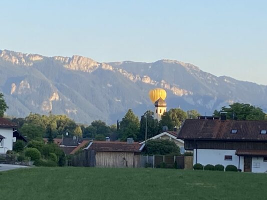 Mit heißer Luft an einem lauen Sommerabend wagte sich ein Ballon bei seiner Fahrt entlang der Chiemgauer Alpen in die Nähe der Wildenwarter Pfarrkirche „Christkönig“.