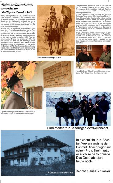 „Grias di god, i bin da Kaspar Riesenberger“  –  meldeet sich ein Besucher.  Das sagte dem Filmmacher zunächst gar nichts. Aber er erzählte dann, dass er immer öfters angesprochen wird, ob er mit den Namen des Schmid von Bach bei Weyarn, Balthasar Riesenberger was zu tun hat. Er wußte es selber nicht. Aber ein gemeinsames Thema war entstanden. Was hat der Schmid von Bach mit der Sendlinger Mordweihnacht zu tun. Niemand weiß etwas darüber. Also machte man sich gemeinsam in das Archiv der Erzdiözese München-Freising. Da nun bereits alles digitalisiert ist, hat man einen leichten Zugriff. Und siehe da, der Name  Riesenberger war in den Archiven einige Male genannt