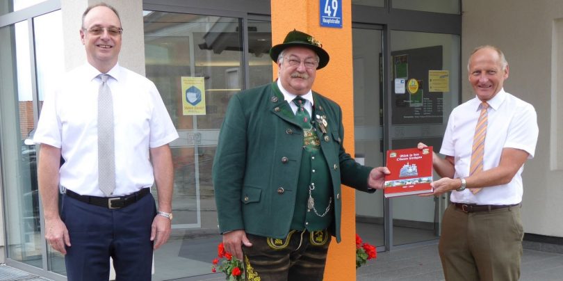 1. Gauvorstand Walter Sirch bedankte sich mit je einem Exemplar der neuen Gauchronik bei Rochus Nickl, stellvertretendes Vorstandsmitglied der Sparkasse Allgäu (Bild 1), sowie Peter Huber und Georg Hummel den Vorständen der Raiffeisenbank südliches Ostallgäu (Bild 2).